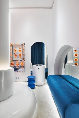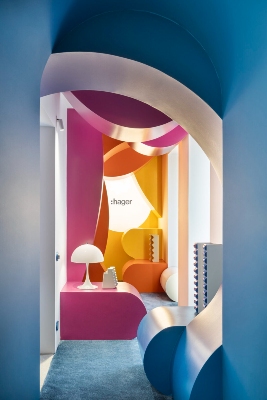 Un espacio inmersivo que reinterpreta el espíritu setentero con curvas envolventes, un conversation pit como corazón social y una paleta blanco/azul que dialoga con la tecnología de Hager y la luz ambiente. Nuestro textil acompaña la arquitectura orgánica, aporta confort y regula la percepción cromática sin añadir ruido visual.