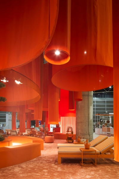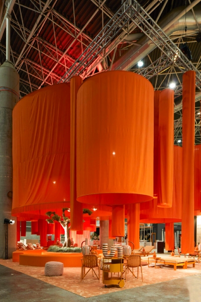 Instalación inmersiva que traslada el atardecer de la Albufera a un paisaje de estructuras y cortinas textiles: recorrido libre, sombras suaves y una paleta naranja que invita a bajar el ritmo, tocar y habitar el espacio. Una pausa emocional en pleno contexto ferial.